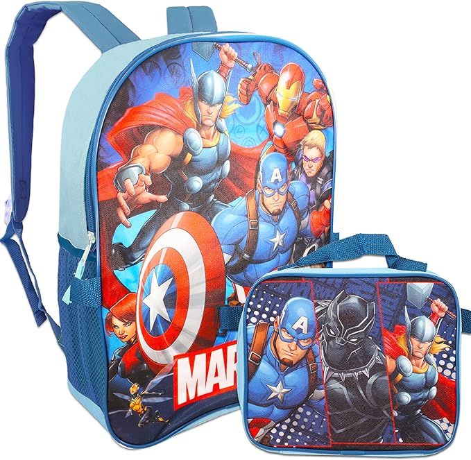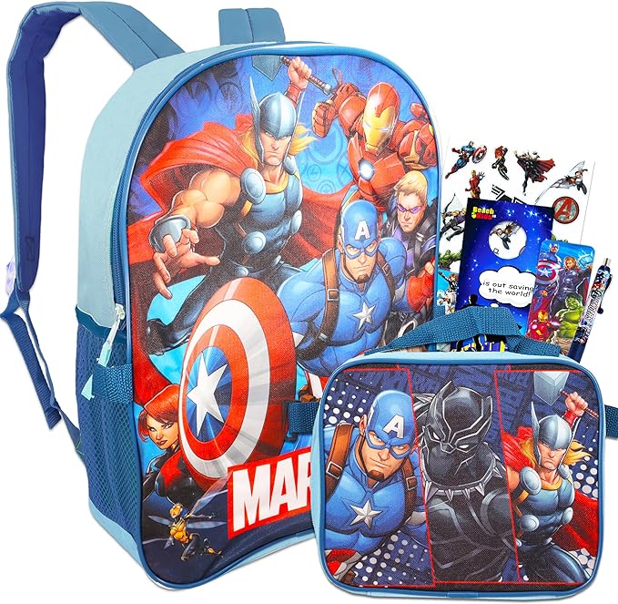 - Sac à dos et boîte à lunch Marvel Avengers pour enfants ~ Sac à dos Deluxe 16 « et sac à lunch isolé avec autocollants, et plus encore (Avengers School Supplies).