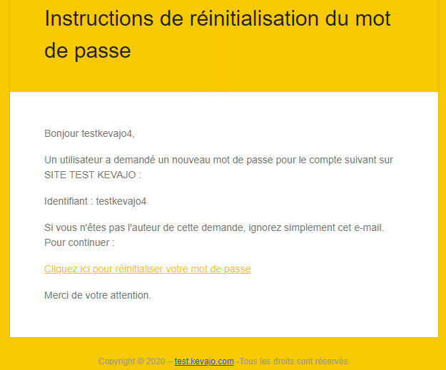 Apres validation de la réinitialisation , vous allez recevoir un message dans votre électronique avec un lien pour réinitialiser et ajouter un nouveau mot de passe.
