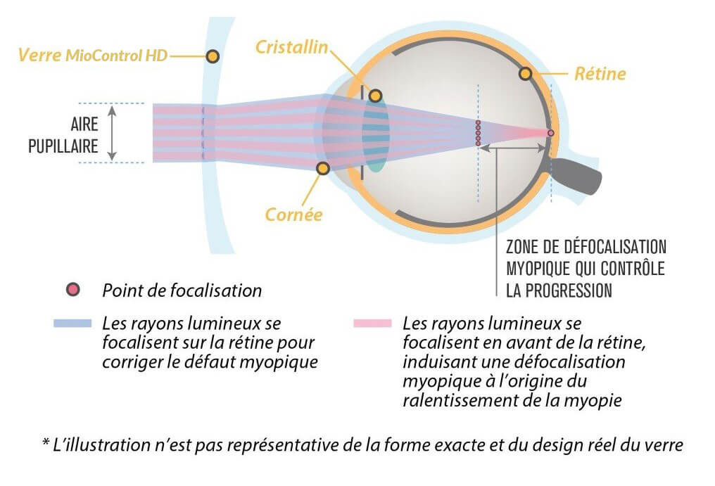Des recherches de pointe menées ont montré que la progression de la myopie peut être contrôlée en fournissant simultanément une vision claire et une dé focalisation myopique soutenue