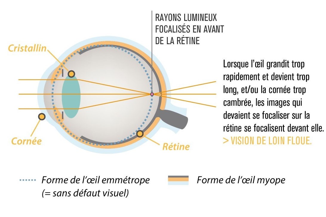 La prévalence de la myopie devrait augmenter considérablement avec les changements de mode de vie, les enfants utilisant de plus en plus une vision de près (utilisation d’appareils numériques, apprentissage et lecture) et passant moins de temps à l’extérieur. Des facteurs génétiques, comportementaux et environnementaux contribuent à l’apparition de la myopie.